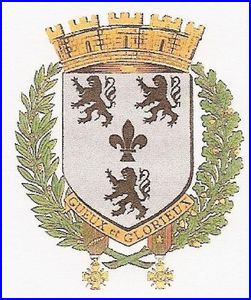 D'argent à trois lionceaux de sable à la fleur de lis au pied nourri du même en coeur.