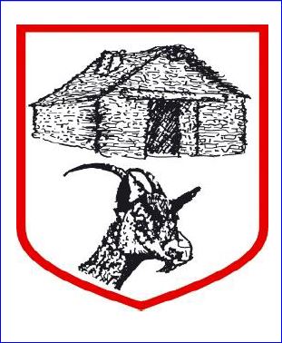D'argent à la cabane en pierres au trait de sable et ouverte du même en chef et à la tête de chèvre contournée et coupée au trait de sable; à la filière de gueules.