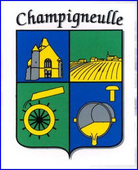 Écartelé: au 1er d'azur à l'église du lieu d'or ombrée d'argent, au 2e de sinople au coteau cultivé d'or, aux sillons de sable en barre, chargé à dextre d'un chemin d'argent en barre et sommé d'un village d'or, au 3e de sinople à la roue de moulin d'or, à douze rais et aubes de sable, surmontée de son abée d'or, au 4e d'azur au creuset de fonderie d'argent couché et posé de front en perspective, ses pivots d'or, et d'où s'écoule une fonte du même, accompagné en chef senestre d'un rivet d'or.