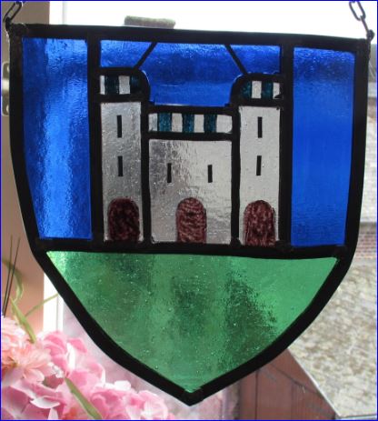 D'azur au château de deux tours d'argent, ouvert de trois portes, sur une terrasse de sinople.