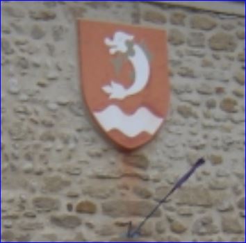 De gueules au dauphin d'argent barbé, crêté et lorré d'or, soutenu d'une fasce ondée d'argent.