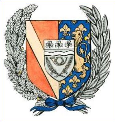 Parti: au 1er de gueules à la bande d'or, au 2e d'azur semé de fleurs de lis d'or et au lion du même brochant; sur le tout, de sinople au grêlier d'or surmonté d'une fasce ondée d'argent et soutenu de deux épis de blé tigés et feuillés d'or, posés en chevron renversé et les tiges passées en sautoir en pointe et au chef d'argent chargé de trois trèfles de sinople.
