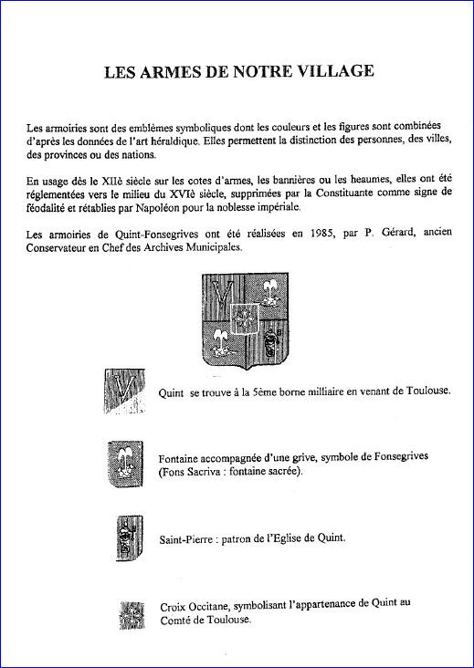 (1985) Écartelé: au 1er de gueules à la lettre V capitale d'or, au 2e de sinople à la fontaine jaillissant d'un rocher sur lequel est perchée une grive, le tout d'argent, au 3e de même contourné, au 4e de gueules à saint Pierre tenant dans sa senestre une clé contournée, le tout d'or; sur le tout, de gueules à la croix cléchée, vidée et pommetée de douze pièces d'or.