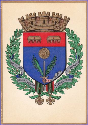 (1966) D'azur au dextrochère de carnation mouvant d'une nuée d'argent, tenant une épée du même garnie d'or, accompagné d'une palme et d'un rameau d'olivier au naturel posés en chevron renversé, le tout surmonté d'un soleil d'or; au chef de gueules chargé de deux râteaux démanchés d'or.