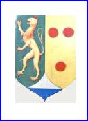 (1970) Parti: au 1er de sinople au lion d'or, armé, lampassé et couronné de gueules, au 2e d'or à trois tourteaux de gueules; enté en pointe coupé d'argent et d'azur.