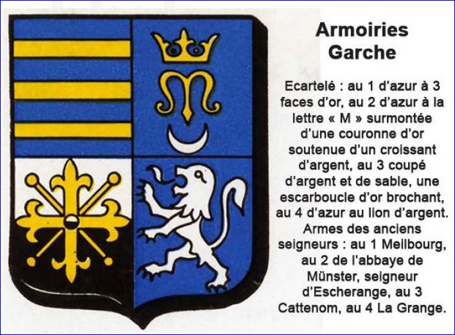 Écartelé: au 1er d'azur à trois fasces d'or, au 2e d'azur à la lettre onciale M d'or couronnée du même et soutenue d'un croissant d'argent, au 3e coupé d'argent et de sable aux rais d'escarboucle d'or, les rais en sautoir pommetés, brochant sur le tout, au 4e d'azur au lion d'argent.