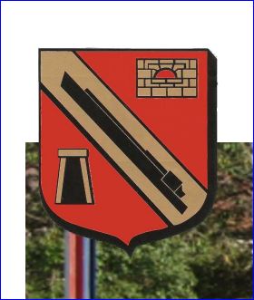 De gueules à la bande d'or chargée d'une péniche de sable, accompagnée en chef d'un four à pain d'or, maçonné de sable et ouvert du champ, et, en pointe, d'une entrée de tunnel d'or ouverte de sable.
