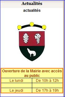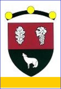 (1999) Coupé: au 1er de gueules à la feuille de chêne d'argent à dextre et à la grappe de raisin feuillée du même à senestre, au 2e de sinople au loup arrêté hurlant d'argent.