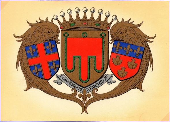 (1434) De gueules à trois coquilles d'argent; au chef cousu d'azur chargé de trois fleurs de lis d'or.