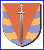De gueules à l'épée basse d'argent, chaussé d'un fascé ondé d'or et d'azur.