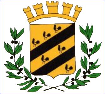 D'or à deux barres de sable accompagnées de six coqs du même, barbés et crêtés de gueules, ordonnés 3 en chef ordonnés en barre, 2 entre les barres et 1 en pointe et rangés en barre.