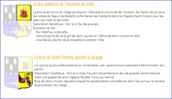 (2005) Écartelé au 1er de sable à trois mains senestres appaumées de carnation, au 2e d'or au feu de gueules, au 3e d'azur au dextrochère d'argent mouvant du flanc senestre d'une nuée de même, tenant un couteau à pied d'argent emmanché de gueules posé en fasce, le tout surmonté d'un carrelet d'argent à dextre, et d'un tranchet du même à senestre emmanché d'or et accompagné de trois fleurs de lis d'or rangées en chef, au 4e d'or au senestrochère de carnation, mouvant de l'angle dextre du chef, vêtu de gueules et tenant une grappe de raisin tigée et feuillée, le tout au naturel.
