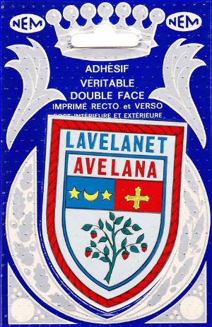 D'argent à la branche de noisetier feuillée de sinople fruitée au naturel; au chef parti au 1er d'azur au croissant d'argent accosté de deux étoiles du même, au 2e de gueules à la croix cléchée, vidée et pommetée de douze pièces d'or.