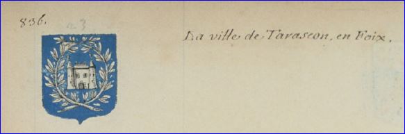 (1701) D'azur au château de trois tours d'argent ouvert du champ, maçonné de sable environné de deux branches de laurier d'argent passées en double sautoir en chef en pointe.