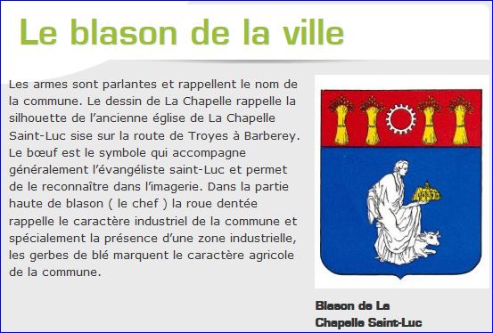 D'azur saint Luc d'argent contourné et le genou dextre posé à terre, tenant dans sa senestre maquette de chapelle d'or, brochant sur un boeuf d'argent contourné et couché à ses pieds derrière lui; au chef cousu de gueules chargé d'une roue dentée d'argent accompagnée de quatre gerbes de blé d'or, deux de chaque côté.