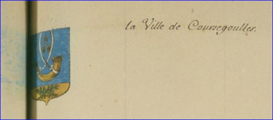 D'azur au cor enfermant trois fleurs de lis mal ordonnées entre le lacs et le cor, le tout d'or; à la champagne d'or chargée de deux rameaux d'olivier de sinople passés en sautoir.