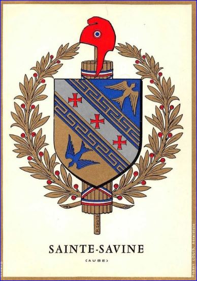 (1962) Tranché d'azur et d'or, à la bande d'argent brochant sur la partition, chargée de trois croisettes pattées de gueules posées à plomb, côtoyée de deux jumelles potencées imbriquées intérieurement, de l'un en l'autre, accompagnée de deux colombes posées en barre, l'une montant vers le chef, l'autre fondant vers la pointe, de l'un en l'autre.