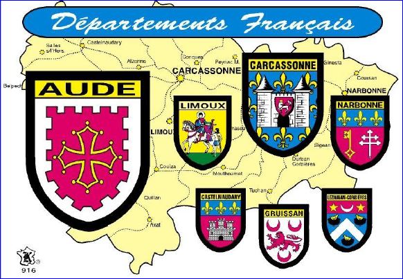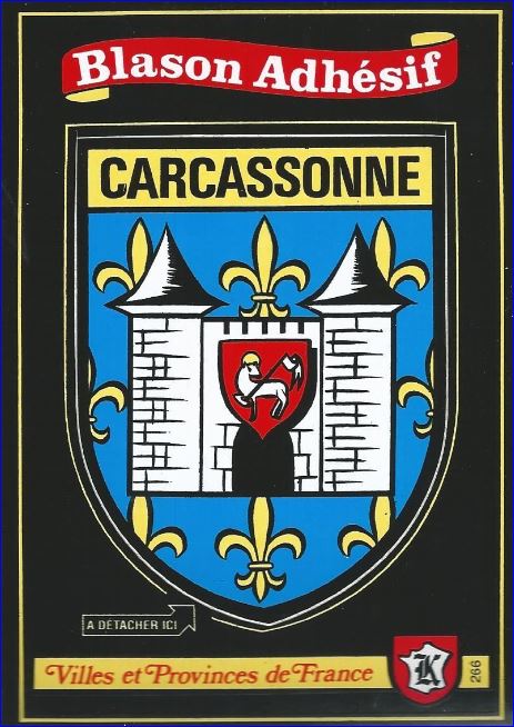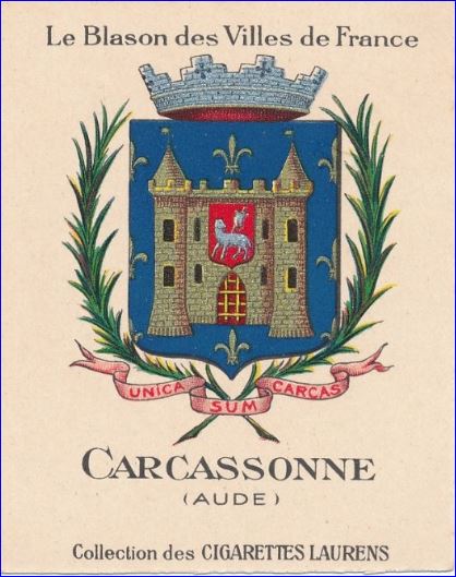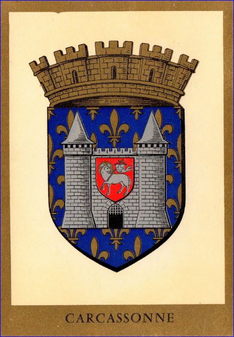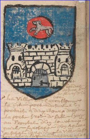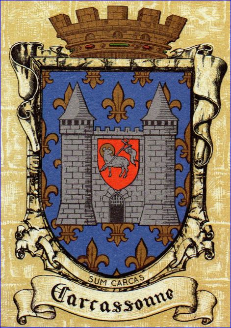 (1229) D'azur semé de fleurs de lis d'or, au portail de ville flanqué de deux tours couvertes d'argent, maçonné, ajouré et ouvert de sable, la porte coulissée d'argent surmontée d'un écusson de gueules à l'agneau pascal d'argent à la tête contournée nimbée d'or, portant un guidon d'argent chargé d'une croisette du champ.