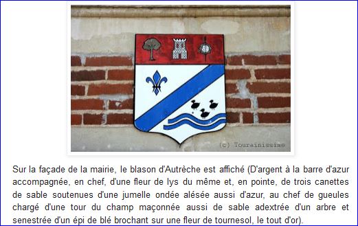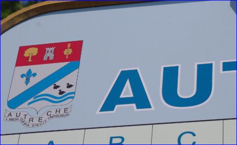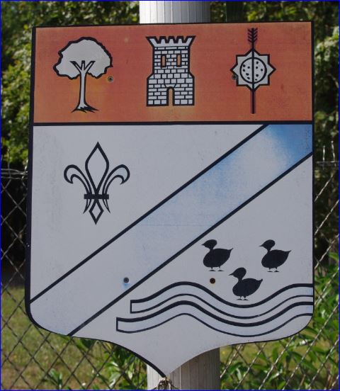 (1989) D'argent à la barre d'azur accompagnée d'une fleur de lis du même en chef et de trois canettes de sable en pointe soutenues d'une jumelle ondée alésée d'azur; au chef de gueules chargé d'une tour d'argent maçonnée de sable adextrée d'un arbre et senestrée d'un épi de blé brochant sur une fleur de tournesol, le tout d'or.