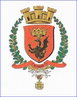 (1991) De gueules à l'épée basse, couronnée d'une couronne ducale d'or, transperçant un dragon éployé de sable papelonné et armé d'or, crachant des flammes d'or.
