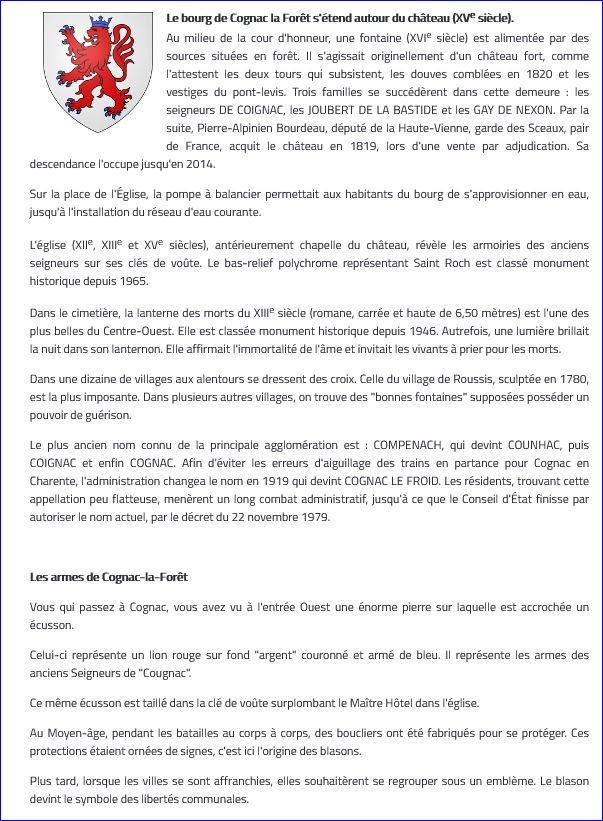 Blason sur le site du Patrimoine de Cognac la Forêt, 2012.