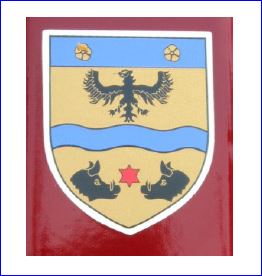 D'or à la fasce ondée abaissée d'azur accompagné en chef d'un aigle de sable et en pointe de deux hures de sanglier affrontées de sable et surmontées d'une étoile six rais de gueules; au chef d'azur chargé de deux quintefeuilles d'or.