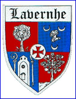 Écartelé: au 1er de gueules à la tête de léopard vomissant des ondes, le tout d'argent, au 2e d'azur au heaume de chevalier taré de profil et accompagné de trois croissants, le tout d'argent, au 3e d'azur à la façade de l'église de saint-Grégoire mouvant de la pointe et accostée de deux crosses adossées, le tout d'argent, au 4e de gueules au vernhe [vergne=aulne] terrassé, le tout d'argent; sur le tout de l'écartelé, un besant d'argent chargé d'une croisette pattée de gueules.