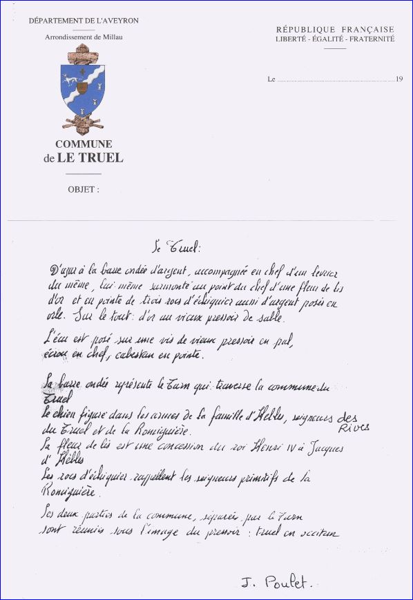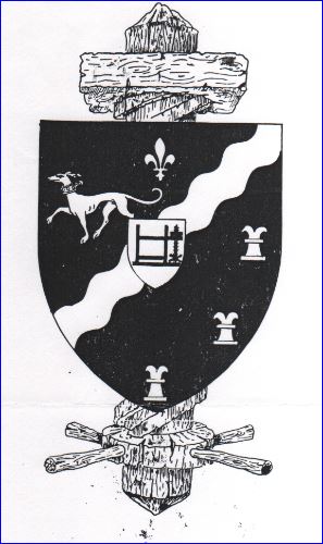 D'azur à la barre ondée d'argent accompagnée en chef d'un lévrier passant du même, lui-même senestré d'une fleur de lis d'or, et accompagnée en pointe de trois rocs d'échiquiers d'argent ordonnés en orle; sur le tout, d'or au vieux pressoir de sable.