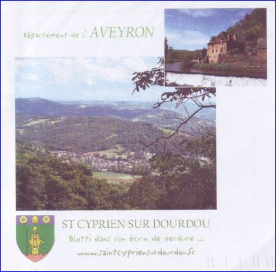 De sinople à saint Cyprien évêque, d'or, posé sur une terrasse ondée, cousue de gueules; au chef cousu d'azur chargé d'une coquille d'or accostée de deux annelets du même.