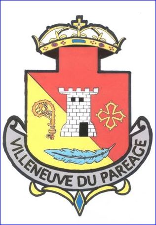 Tranché de gueules et d'or, à la tour d'argent, maçonnée, ouverte et ajourée de sable, accompagnée à dextre d'une tête de crosse de tenné, à senestre d'une croix cléchée, pommetée de douze pièces et vidée, d'or et en pointe d'une plume d'azur posée en fasce.