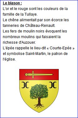 (1996) D'or au chêne au naturel, accosté en chef de deux fers de moulin de sable; au chef de gueules chargé d'une épée du champ posée en fasce, la pointe à senestre.