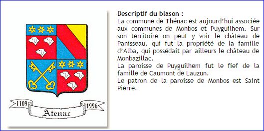 (1996) Écartelé: aux 1er et 4e de gueules à trois têtes de chiens courants d'argent, au chef cousu d'azur chargé de trois molettes d'or (THENAC), au 2e tiercé en bandes d'or, de gueules et d'azur (PUYGUILHEM), au 3e d'azur à deux clefs d'or, passées en sautoir (MONBOS).