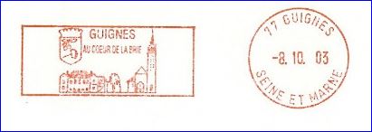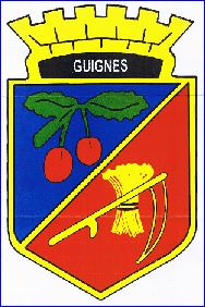 Taillé: au 1er d'azur à deux cerises de gueules tigées et feuillées de sinople, au 2e d'azur à la gerbe de blé d'or et à la faux du même, posée en barre, brochante, le fer vidé et dirigé vers la pointe; au filet en barre d'or brochant sur la partition, le tout dans une filière du même.