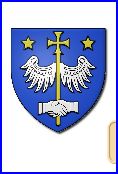 D'azur au vol abaissé d'argent, à la croisette de procession pattée d'or, la hampe brochant sur le vol, accostée en chef de deux étoiles du même et accompagnée d'une foi d'argent brochant en pointe.
