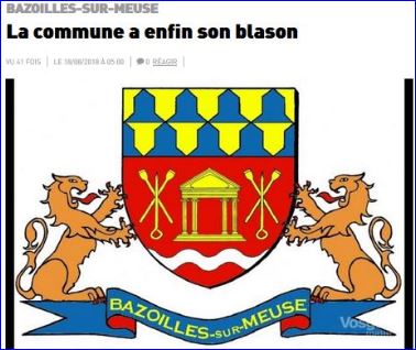 (2018) De gueules au portique à quatre colonnes d'or accostés de quatre ringards d'or passés deux à deux en sautoir, chaque sautoir surchargé d'une pique du même brochant en pal, l'anneau en bas, le tout soutenu d'une burelle ondée d'argent; au chef vairé d'or et d'azur.