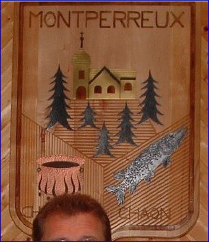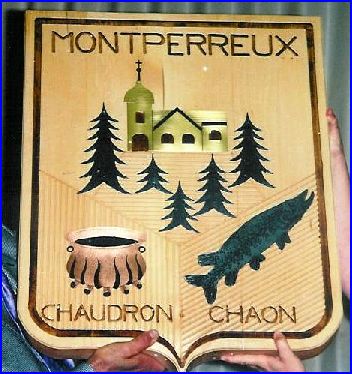 Tiercé en pairle abaissé: au 1er d'argent à l'église du lieu d'or posée sur un mont d'azur chargé de cinq sapins de sinople brochants, au 2e de gueules au chaudron d'or sur des flammes de sable, au 3e de sinople au brochet d'argent posé en barre.