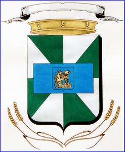 Gironné de sinople et d'argent, à la fasce alésée d'azur brochante et chargée de saint Georges à cheval, contourné et tuant le dragon, d'or.