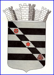D'argent à trois fasces de sable, à la bande du même brochante, chargée de trois fasces d'argent surchargées, la 1ère d'une rose de gueules boutonnée du champ, la 2e d'une molette de gueules et la 3e d'un ornement architectural du même.