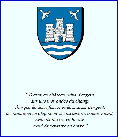 D'azur au château masuré d'argent, maçonné de sable, ouvert et ajouré du champ, posé sur une champagne ondée d'azur chargée de deux fasces ondées d'argent, accompagné de deux oiseaux du même en chef, volant vers le coeur, celui de dextre en bande et celui de senestre en barre.