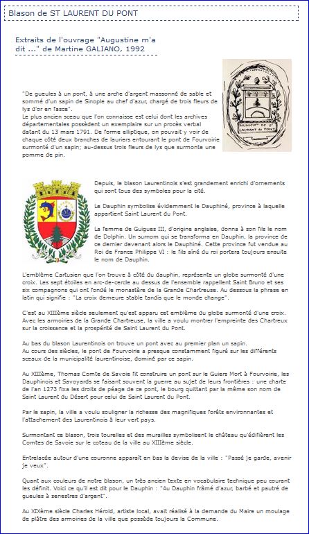 Coupé: au 1er parti, au I d'or au dauphin d'azur barbé, crêté, lorré, oreillé et peautré de gueules, au II d'argent au monde d'azur cintré et croiseté d'or surmonté de sept étoiles d'or, ordonnées en arc de cercle, celle du milieu plus grande, .et soutenu d'un listel d'or charge de l'inscription de sable « Stat Crux dum volvitur orbis » (La croix demeure stable tandis que le monde change), au 2e de gueules au pont d'une arche, d'argent maçonné de sable, au sapin de sinople mouvant de la pointe et brochant sur le pont.