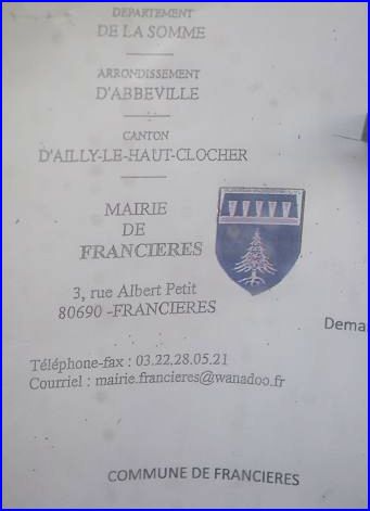 Modification par rapport au blason officieux de 1990: le champ d'azur a été chargé d'un sapin arraché d'argent qui évoque le grand bois qui jouxte la commune, ancien bois du domaine du château qui possède la particularité, rare en Picardie, d'être en grande partie un bois de sapins. Les couleurs argent et azur, si elles devaient être justifiées, le seraient par l'existence ancienne et jusqu'au XIXe siècle, à Francières, d'un pèlerinage à la Vierge qu'y faisaient les matelots d'Abbeville le jour de la Nativité.
