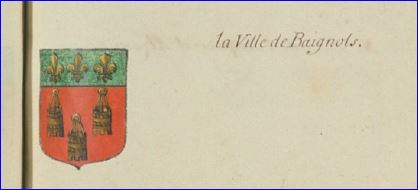 De gueules à trois tinettes [cuvettes] d'or suspendues chacune à un anneau par un cordon du même; au chef cousu de sinople (d'azur) chargé de trois fleurs de lis d'or.