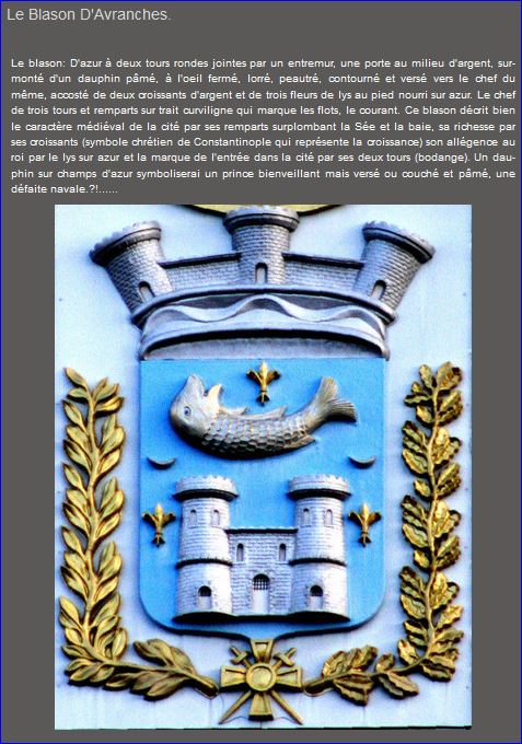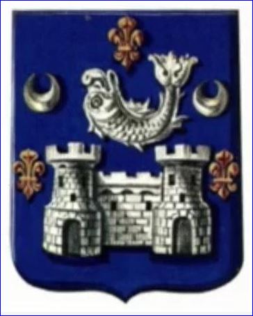 D'azur à deux tours rondes jointes par un entre-mur, ouvertes, ajourées et maçonnées de sable, surmontées d'un dauphin versé d'argent accosté de deux croissants du même et accompagnées de trois fleurs de lis d'or, une en chef et deux aux flancs.