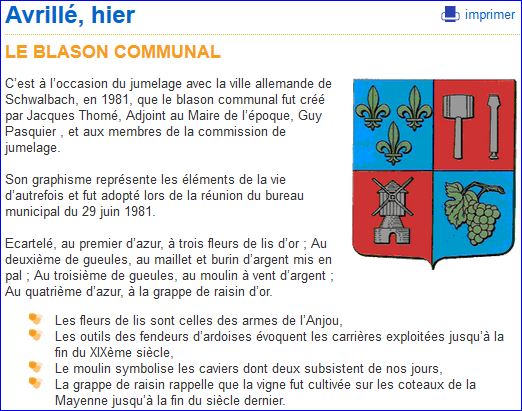 (1981) Écartelé: au 1er d'azur à trois fleurs de lis d'or, au 2e de gueules au maillet et au burin d'argent posés en pal et rangés en fasce, au 3e de gueules au moulin à vent d'argent, au 4e d'azur à la grappe de raisin tigée et feuillée d'or.