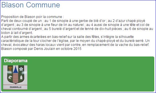 (2015) Parti de deux coupé de un: au 1er de sinople à la gerbe de blé d'or, au 2e d'azur chapé ployé d'argent, au 3e de sinople à la fleur de lin au naturel, au 4e de sinople à une tête et col de cheval contourné d'argent, au 5e burelé d'argent et de tenné de dix-huit pièces, au 6e de sinople au bidon à lait d'argent.