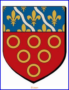 De gueules à six annelets d'or ordonnés 3, 2 et 1; au chef d'azur semé de fleurs de lis d'or et à deux cotices ondées d'argent brochantes.