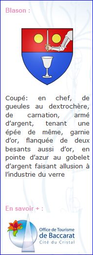 Coupé: au 1er de gueules au dextrochère de carnation armé d'argent (vêtu d'azur, mouvant d'une nuée d'argent), tenant une épée haute du même garnie d'or, accostée de deux besants (cailloux) du même, au 2e d'azur au verre à pied d'argent.