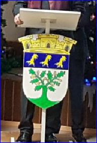 (2006) D'argent au chêne terrassé de sinople, englanté d'or; au chef d'azur chargé de trois pattes de loup d'or.