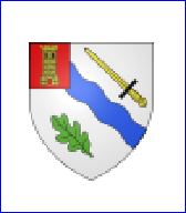 D'argent à la bande ondée d'azur accompagnée d'une épée d'or à la garde de sable posée en bande, en chef et d'une feuille de chêne de sinople posée en bande en pointe; au franc-canton de gueules chargé d'une tour d'or ouverte, ajourée et maçonnée de sable.