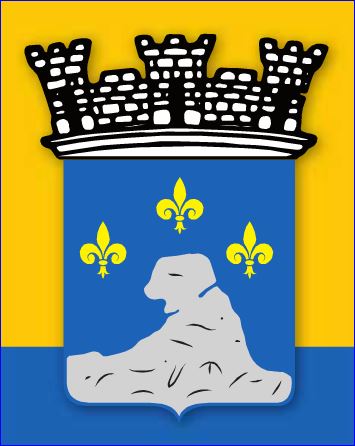 D'azur au rocher recourbé d'argent mouvant de la pointe surmonté de trois fleurs de lis d'or mal ordonnées.